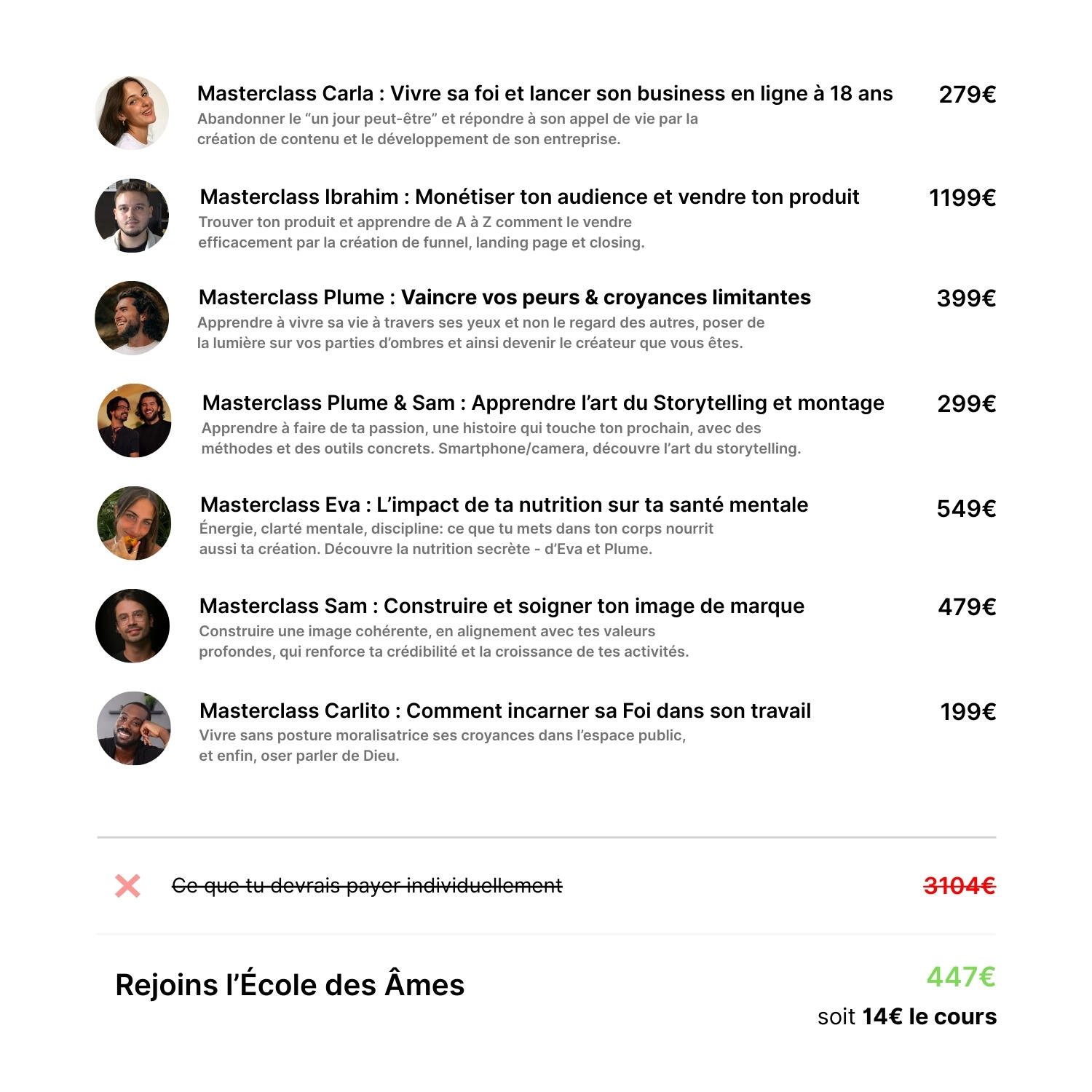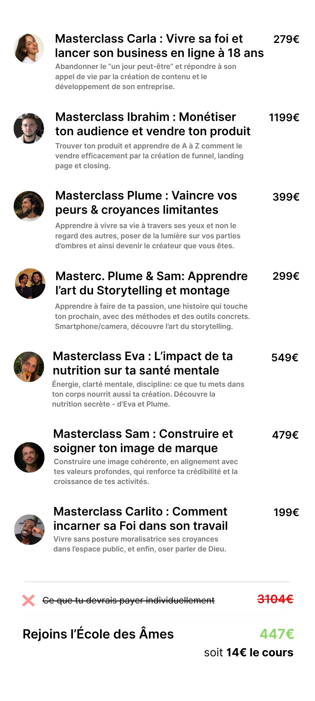 ➜ 2 lives chaque mercredi (20h30 masterclass pour tous; 18h30 accompagnement 1-to-4 pour les sélectionnés) + modules hors ligne, avec Sam, Plume, Ibra, Eva, Carla et Carlito.